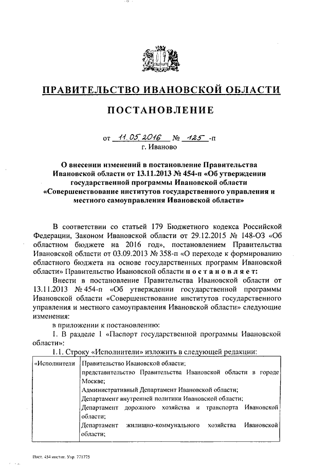 Постановление Правительства Ивановской области от 11.05.2016 N 125-п "О внесении изменений в постановление Правительства Ивановской области от 13.11.2013 N 454-п "Об утверждении государственной программы Ивановской области "Совершенствование институтов государственного управления и местного самоуправления Ивановской области"