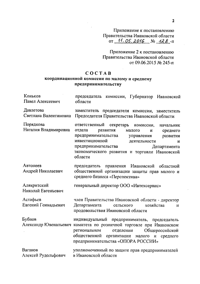 Постановление Правительства Ивановской области от 11.05.2016 N 128-п "О внесении изменения в постановление Правительства Ивановской области от 09.06.2015 N 245-п "О координационной комиссии по малому и среднему предпринимательству"
