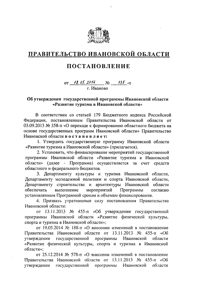 Постановление Правительства Ивановской области от 18.05.2016 N 135-п "Об утверждении государственной программы Ивановской области "Развитие туризма в Ивановской области"
