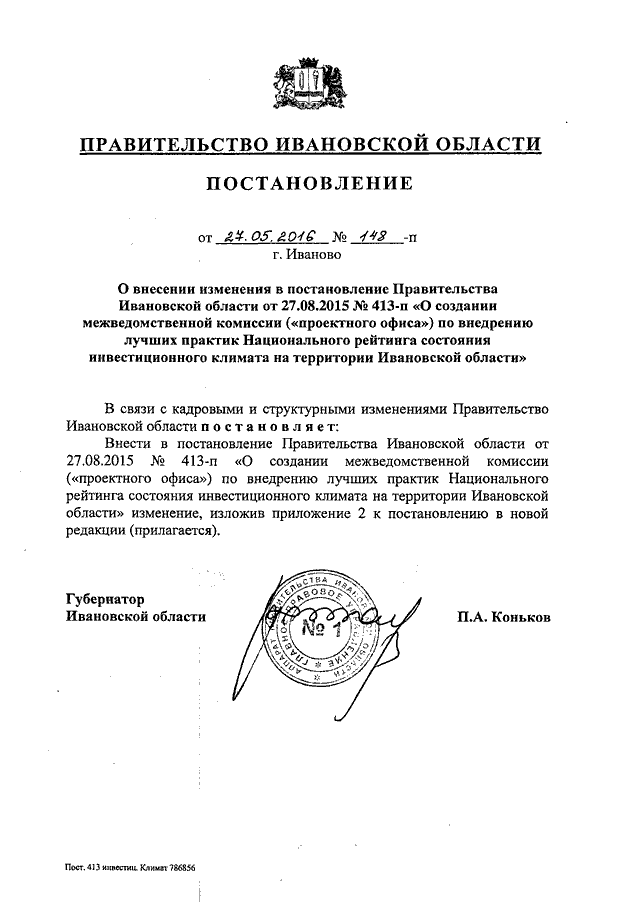 Постановление Правительства Ивановской области от 27.05.2016 N 148-п "О внесении изменения в постановление Правительства Ивановской области от 27.08.2015 N 413-п "О создании межведомственной комиссии ("проектного офиса") по внедрению лучших практик Национального рейтинга состояния инвестиционного климата на территории Ивановской области"