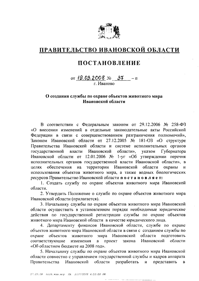Постановление Правительства Ивановской области от 19.03.2008 N 37-п "О создании службы по охране объектов животного мира Ивановской области" (вместе с "Положением о службе по охране объектов животного мира Ивановской области")
