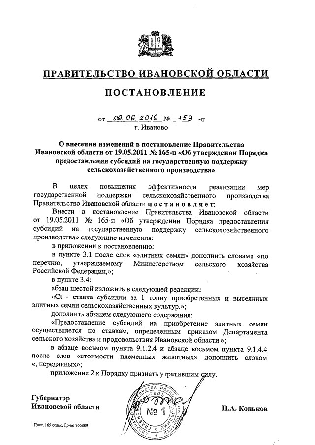 Постановление Правительства Ивановской области от 09.06.2016 N 159-п "О внесении изменений в постановление Правительства Ивановской области от 19.05.2011 N 165-п "Об утверждении Порядка предоставления субсидий на государственную поддержку сельскохозяйственного производства"