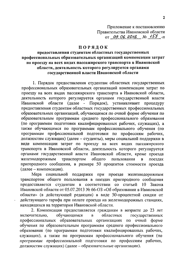 Постановление Правительства Ивановской области от 09.06.2016 N 157-п "Об утверждении Порядка предоставления студентам областных государственных профессиональных образовательных организаций компенсации затрат по проезду на всех видах пассажирского транспорта в Ивановской области, деятельность которого регулируется органами государственной власти Ивановской области"