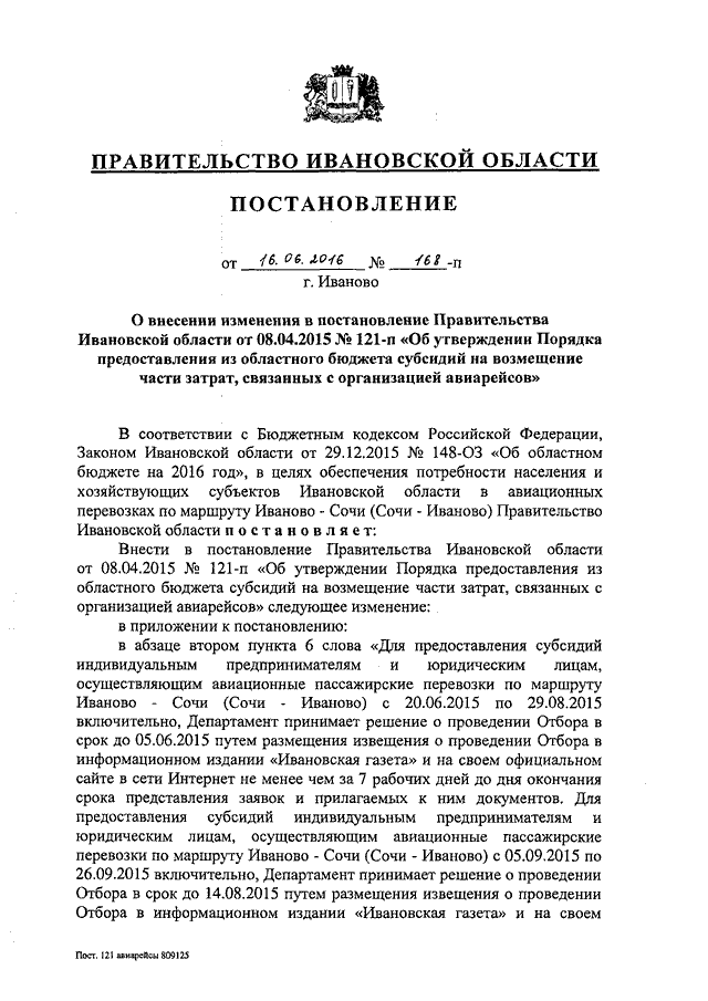 Постановление Правительства Ивановской области от 16.06.2016 N 168-п "О внесении изменения в постановление Правительства Ивановской области от 08.04.2015 N 121-п "Об утверждении Порядка предоставления из областного бюджета субсидий на возмещение части затрат, связанных с организацией авиарейсов"