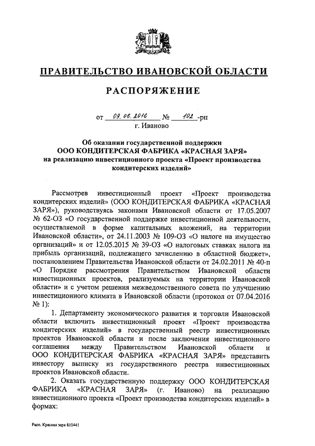 Распоряжение Правительства Ивановской области от 09.06.2016 N 102-рп "Об оказании государственной поддержки ООО КОНДИТЕРСКАЯ ФАБРИКА "КРАСНАЯ ЗАРЯ" на реализацию инвестиционного проекта "Проект производства кондитерских изделий"