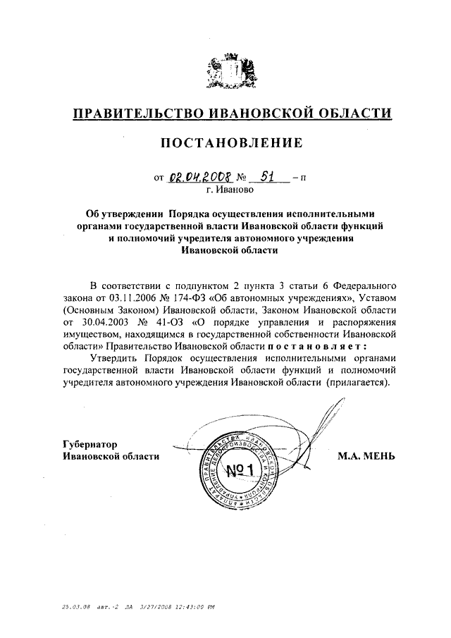 Постановление Правительства Ивановской области от 02.04.2008 N 51-п "Об утверждении Порядка осуществления исполнительными органами государственной власти Ивановской области функций и полномочий учредителя автономного учреждения Ивановской области"