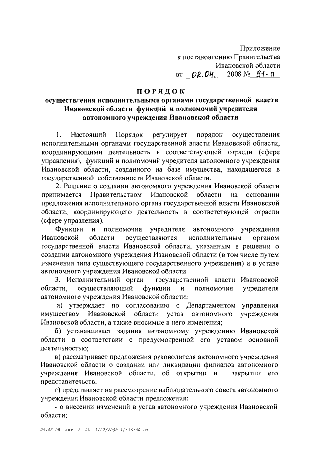 Постановление Правительства Ивановской области от 02.04.2008 N 51-п "Об утверждении Порядка осуществления исполнительными органами государственной власти Ивановской области функций и полномочий учредителя автономного учреждения Ивановской области"