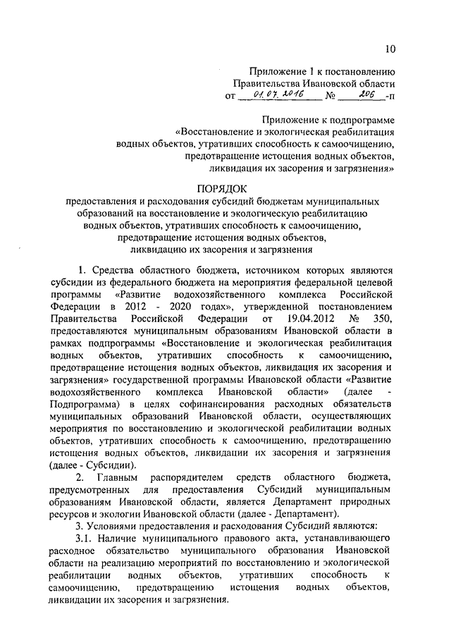 Постановление Правительства Ивановской области от 01.07.2016 N 206-п "О внесении изменений в постановление Правительства Ивановской области от 30.10.2013 N 430-п "Об утверждении государственной программы Ивановской области "Развитие водохозяйственного комплекса Ивановской области" (вместе с "Порядком предоставления и расходования субсидий бюджетам муниципальных образований на восстановление и экологическую реабилитацию водных объектов, утративших способность к самоочищению, предотвращение истощения водных объектов, ликвидацию их засорения и загрязнения", "Порядком предоставления и расходования субсидий бюджетам муниципальных образований на повышение эксплуатационной надежности гидротехнических сооружений", "Порядком предоставления и расходования субсидий бюджетам муниципальных образований на обеспечение населения и объектов экономики сооружениями инженерной защиты")