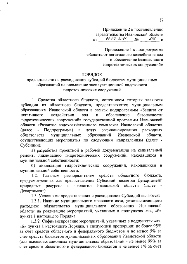 Постановление Правительства Ивановской области от 01.07.2016 N 206-п "О внесении изменений в постановление Правительства Ивановской области от 30.10.2013 N 430-п "Об утверждении государственной программы Ивановской области "Развитие водохозяйственного комплекса Ивановской области" (вместе с "Порядком предоставления и расходования субсидий бюджетам муниципальных образований на восстановление и экологическую реабилитацию водных объектов, утративших способность к самоочищению, предотвращение истощения водных объектов, ликвидацию их засорения и загрязнения", "Порядком предоставления и расходования субсидий бюджетам муниципальных образований на повышение эксплуатационной надежности гидротехнических сооружений", "Порядком предоставления и расходования субсидий бюджетам муниципальных образований на обеспечение населения и объектов экономики сооружениями инженерной защиты")