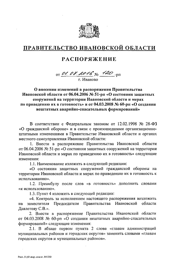 Распоряжение Правительства Ивановской области от 01.07.2016 N 120-рп "О внесении изменений в распоряжения Правительства Ивановской области от 06.04.2006 N 51-рп "О состоянии защитных сооружений на территории Ивановской области и мерах по приведению их в готовность" и от 04.03.2008 N 60-рп "О создании нештатных аварийно-спасательных формирований"