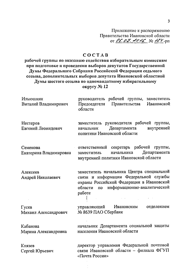 Распоряжение Правительства Ивановской области от 06.07.2016 N 124-рп "О создании рабочей группы по оказанию содействия избирательным комиссиям при подготовке и проведении выборов депутатов Государственной Думы Федерального Собрания Российской Федерации седьмого созыва, дополнительных выборов депутата Ивановской областной Думы шестого созыва по одномандатному избирательному округу N 12"