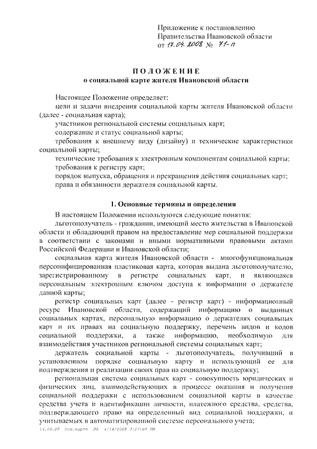 Постановление Правительства Ивановской области от 17.04.2008 N 71-п "Об утверждении Положения о социальной карте жителя Ивановской области"