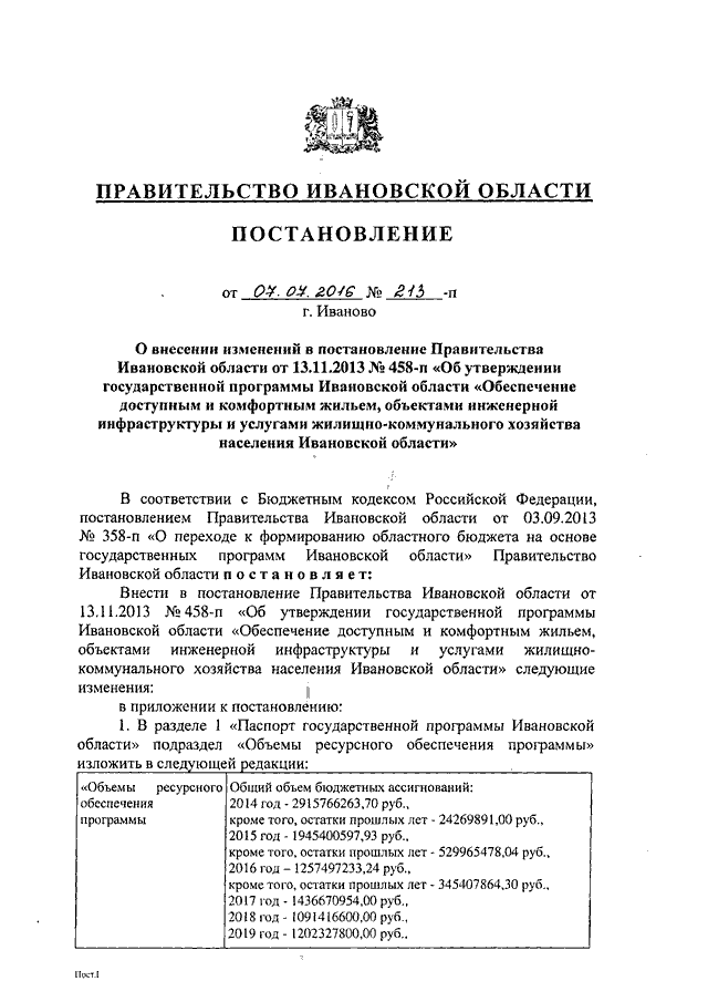 Постановление Правительства Ивановской области от 07.07.2016 N 213-п "О внесении изменений в постановление Правительства Ивановской области от 13.11.2013 N 458-п "Об утверждении государственной программы Ивановской области "Обеспечение доступным и комфортным жильем, объектами инженерной инфраструктуры и услугами жилищно-коммунального хозяйства населения Ивановской области" (вместе с "Порядком предоставления и распределения субсидий из бюджета Ивановской области бюджетам муниципальных образований Ивановской области на разработку (корректировку) проектной документации и газификацию населенных пунктов, объектов социальной инфраструктуры Ивановской области", "Порядком предоставления и расходования субсидий из бюджета Ивановской области бюджетам муниципальных образований Ивановской области на возмещение затрат (части затрат) на уплату процентов по кредитам, полученным муниципальными образованиями или юридическими лицами в кредитных организациях на обеспечение инженерной инфраструктурой земельных участков, предназначенных для строительства жилья экономкласса", "Порядком предоставления и расходования субсидий из бюджета Ивановской области бюджетам муниципальных образований Ивановской области на строительство (реконструкцию) объектов социальной инфраструктуры в рамках реализации проектов по комплексному развитию территорий, предусматривающих строительство жилья экономкласса, на строительство (реконструкцию) автомобильных дорог в новых микрорайонах массовой малоэтажной и многоквартирной застройки жильем экономкласса")