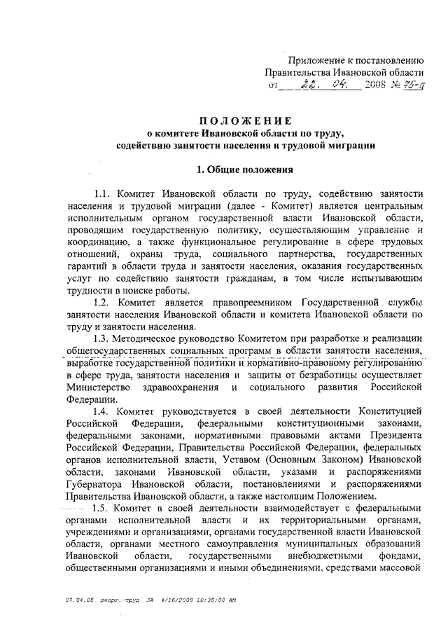Постановление Правительства Ивановской области от 22.04.2008 N 75-п "О переименовании Государственной службы занятости населения Ивановской области" (вместе с "Положением о комитете Ивановской области по труду, содействию занятости населения и трудовой миграции")