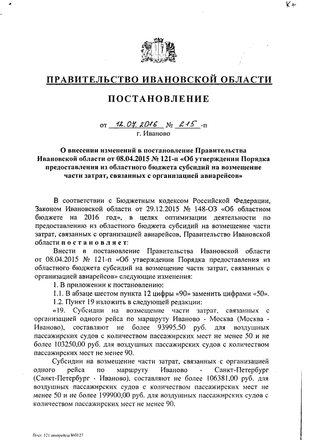 Постановление Правительства Ивановской области от 12.07.2016 N 215-п "О внесении изменений в постановление Правительства Ивановской области от 08.04.2015 N 121-п "Об утверждении Порядка предоставления из областного бюджета субсидий на возмещение части затрат, связанных с организацией авиарейсов"