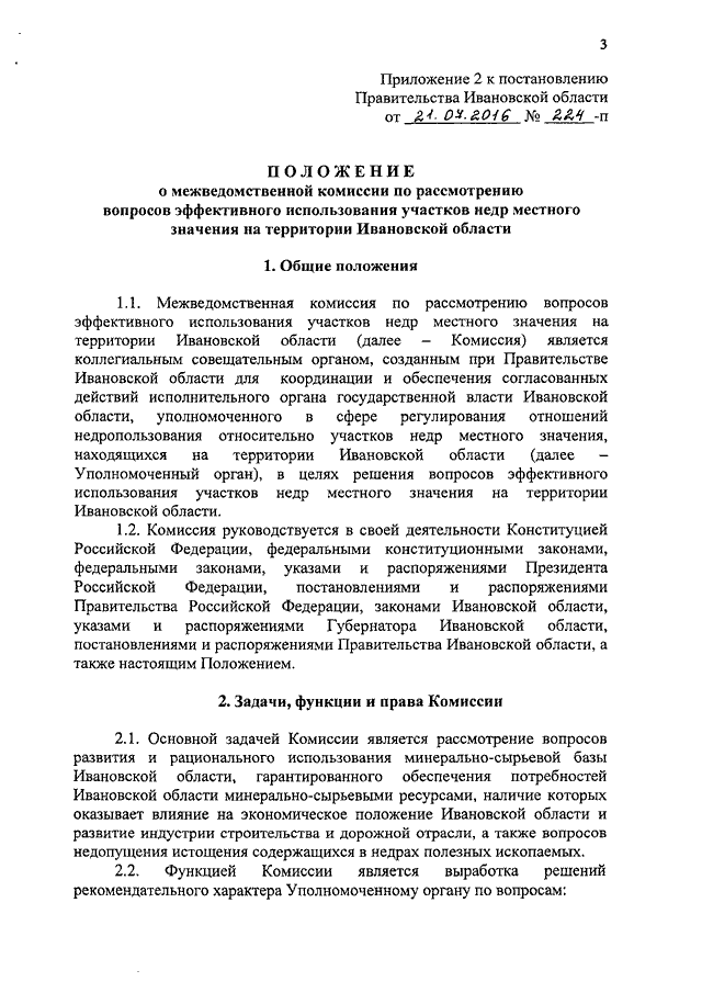 Постановление Правительства Ивановской области от 21.07.2016 N 224-п "О создании межведомственной комиссии по рассмотрению вопросов эффективного использования участков недр местного значения на территории Ивановской области" (вместе с "Положением о межведомственной комиссии по рассмотрению вопросов эффективного использования участков недр местного значения на территории Ивановской области")