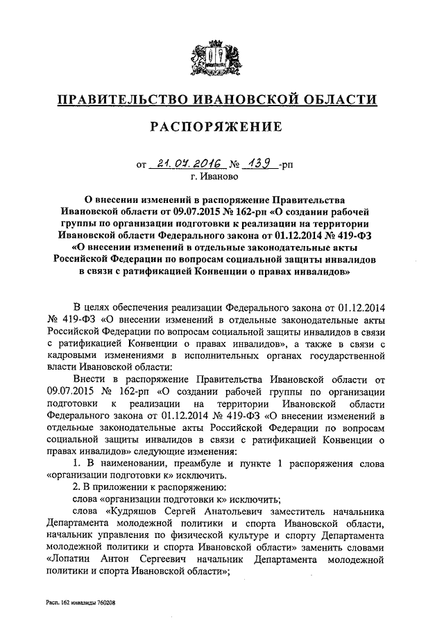 Распоряжение Правительства Ивановской области от 21.07.2016 N 139-рп "О внесении изменений в распоряжение Правительства Ивановской области от 09.07.2015 N 162-рп "О создании рабочей группы по организации подготовки к реализации на территории Ивановской области Федерального закона от 01.12.2014 N 419-ФЗ "О внесении изменений в отдельные законодательные акты Российской Федерации по вопросам социальной защиты инвалидов в связи с ратификацией Конвенции о правах инвалидов"