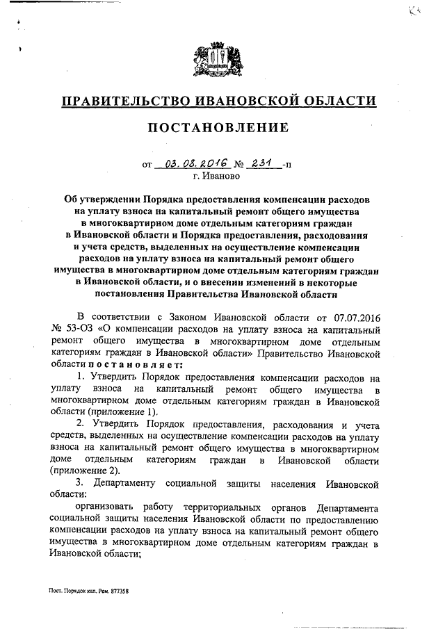Постановление Правительства Ивановской области от 03.08.2016 N 231-п "Об утверждении Порядка предоставления компенсации расходов на уплату взноса на капитальный ремонт общего имущества в многоквартирном доме отдельным категориям граждан в Ивановской области и Порядка предоставления, расходования и учета средств, выделенных на осуществление компенсации расходов на уплату взноса на капитальный ремонт общего имущества в многоквартирном доме отдельным категориям граждан в Ивановской области, и о внесении изменений в некоторые постановления Правительства Ивановской области"