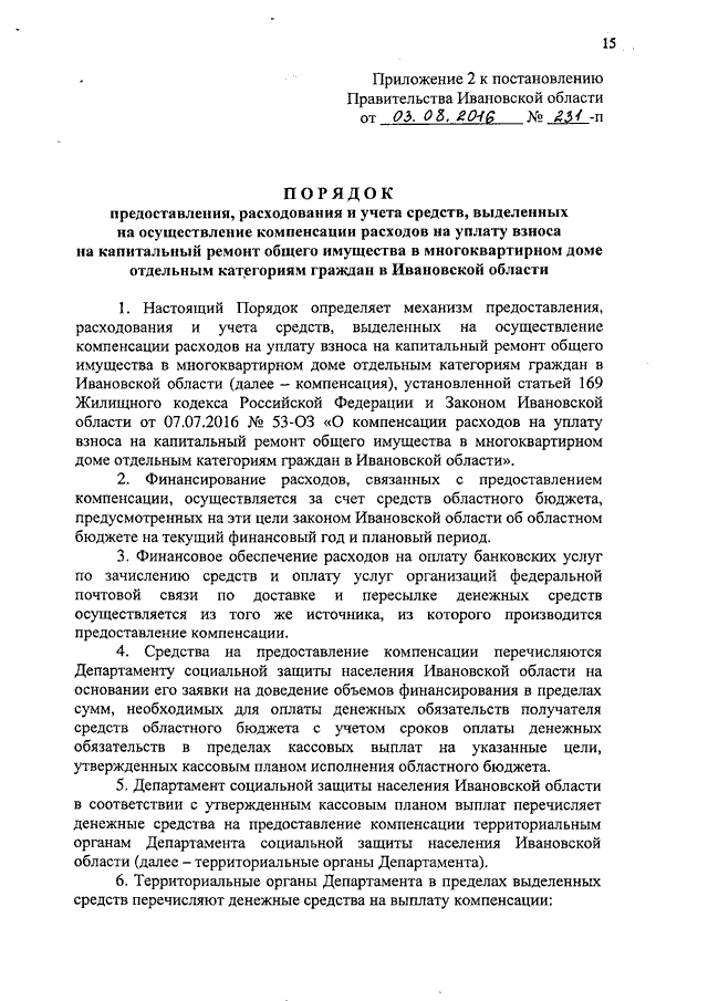 Постановление Правительства Ивановской области от 03.08.2016 N 231-п "Об утверждении Порядка предоставления компенсации расходов на уплату взноса на капитальный ремонт общего имущества в многоквартирном доме отдельным категориям граждан в Ивановской области и Порядка предоставления, расходования и учета средств, выделенных на осуществление компенсации расходов на уплату взноса на капитальный ремонт общего имущества в многоквартирном доме отдельным категориям граждан в Ивановской области, и о внесении изменений в некоторые постановления Правительства Ивановской области"