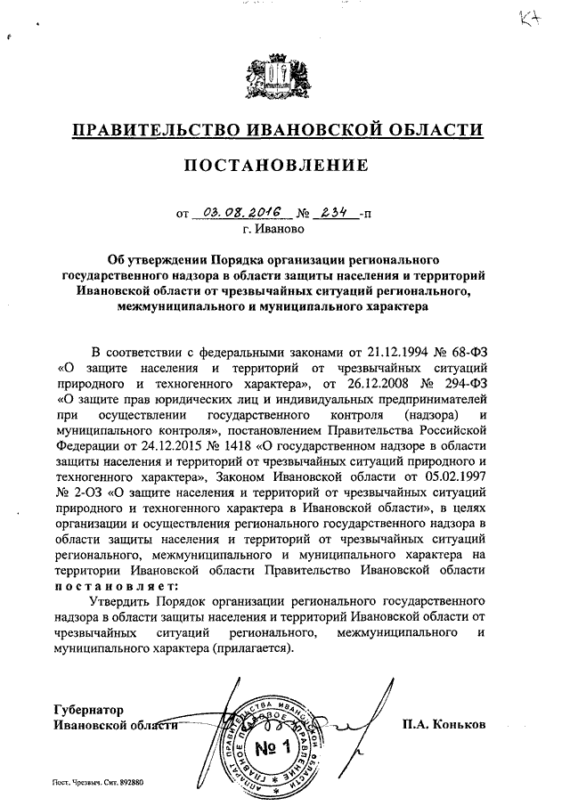 Постановление Правительства Ивановской области от 03.08.2016 N 234-п "Об утверждении Порядка организации регионального государственного надзора в области защиты населения и территорий Ивановской области от чрезвычайных ситуаций регионального, межмуниципального и муниципального характера"
