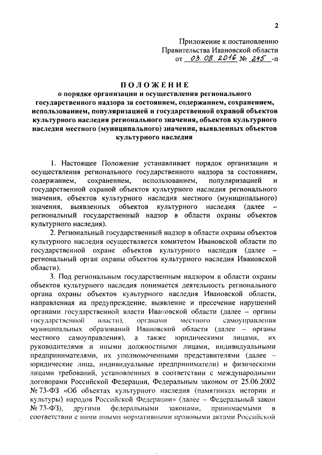 Постановление Правительства Ивановской области от 03.08.2016 N 245-п "О региональном государственном надзоре в области охраны объектов культурного наследия" (вместе с "Положением о порядке организации и осуществления регионального государственного надзора за состоянием, содержанием, сохранением, использованием, популяризацией и государственной охраной объектов культурного наследия регионального значения, объектов культурного наследия местного (муниципального) значения, выявленных объектов культурного наследия")