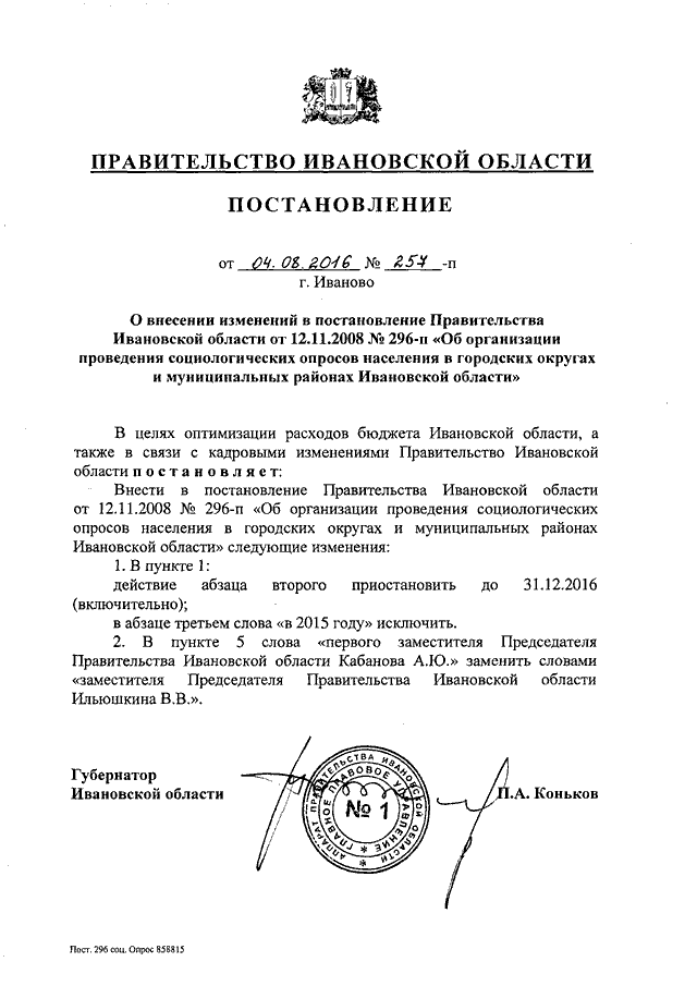 Постановление Правительства Ивановской области от 04.08.2016 N 257-п "О внесении изменений в постановление Правительства Ивановской области от 12.11.2008 N 296-п "Об организации проведения социологических опросов населения в городских округах и муниципальных районах Ивановской области"