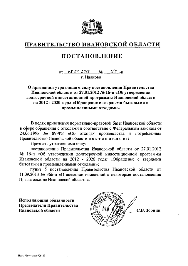 Постановление Правительства Ивановской области от 08.08.2016 N 259-п "О признании утратившим силу постановления Правительства Ивановской области от 27.01.2012 N 16-п "Об утверждении долгосрочной инвестиционной программы Ивановской области на 2012 - 2020 годы "Обращение с твердыми бытовыми и промышленными отходами"