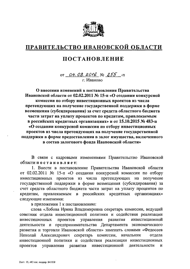 Постановление Правительства Ивановской области от 04.08.2016 N 255-п "О внесении изменений в постановления Правительства Ивановской области от 02.02.2011 N 15-п "О создании конкурсной комиссии по отбору инвестиционных проектов из числа претендующих на получение государственной поддержки в форме возмещения (субсидирования) за счет средств областного бюджета части затрат на уплату процентов по кредитам, привлекаемым в российских кредитных организациях" и от 15.10.2015 N 483-п "О создании конкурсной комиссии по отбору инвестиционных проектов из числа претендующих на получение государственной поддержки в форме предоставления в залог имущества, включенного в состав залогового фонда Ивановской области"