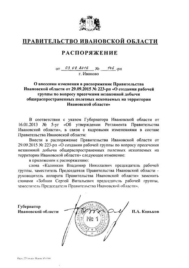 Распоряжение Правительства Ивановской области от 03.08.2016 N 146-рп "О внесении изменения в распоряжение Правительства Ивановской области от 29.09.2015 N 223-рп "О создании рабочей группы по вопросу пресечения незаконной добычи общераспространенных полезных ископаемых на территории Ивановской области"