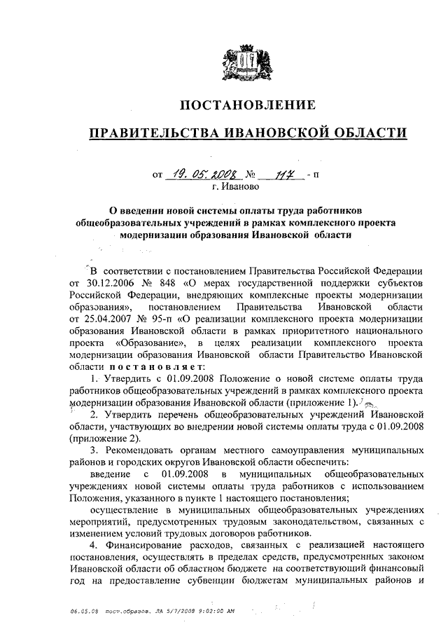 Постановление Правительства Ивановской области от 19.05.2008 N 117-п "О введении новой системы оплаты труда работников общеобразовательных учреждений в рамках комплексного проекта модернизации образования Ивановской области" (вместе с "Положением о новой системе оплаты труда работников общеобразовательных учреждений в рамках комплексного проекта модернизации образования Ивановской области", "Перечнем общеобразовательных учреждений Ивановской области, участвующих во внедрении новой системы оплаты труда с 01.09.2008")