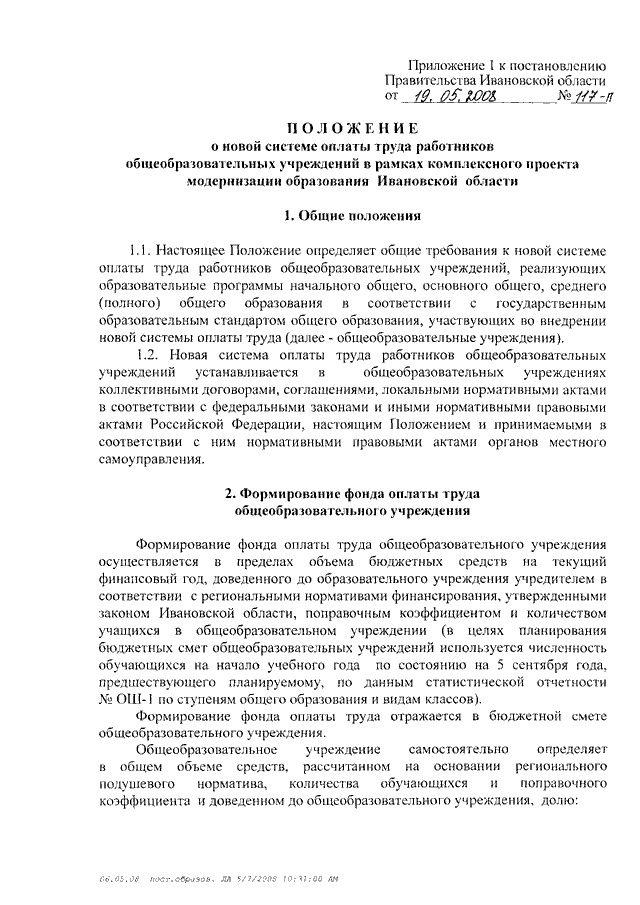 Постановление Правительства Ивановской области от 19.05.2008 N 117-п "О введении новой системы оплаты труда работников общеобразовательных учреждений в рамках комплексного проекта модернизации образования Ивановской области" (вместе с "Положением о новой системе оплаты труда работников общеобразовательных учреждений в рамках комплексного проекта модернизации образования Ивановской области", "Перечнем общеобразовательных учреждений Ивановской области, участвующих во внедрении новой системы оплаты труда с 01.09.2008")