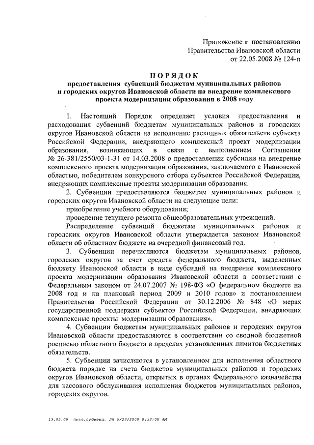 Постановление Правительства Ивановской области от 22.05.2008 N 124-п "Об утверждении Порядка предоставления субвенций бюджетам муниципальных районов и городских округов Ивановской области на внедрение комплексного проекта модернизации образования в 2008 году"