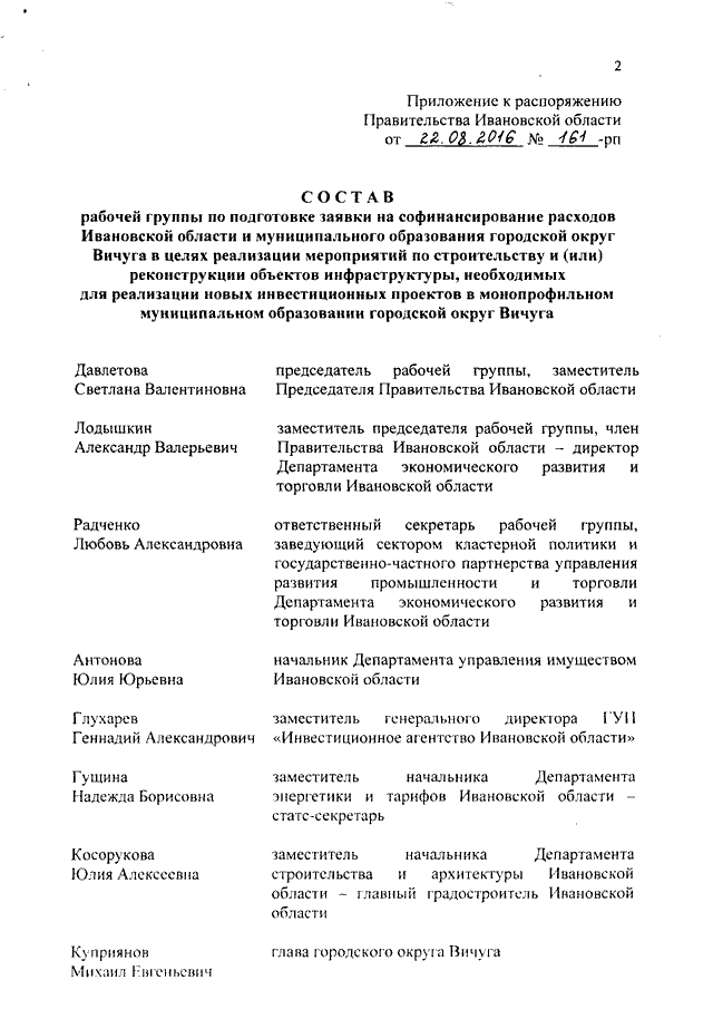 Распоряжение Правительства Ивановской области от 22.08.2016 N 161-рп "О рабочей группе по подготовке заявки на софинансирование расходов Ивановской области и муниципального образования городской округ Вичуга в целях реализации мероприятий по строительству и (или) реконструкции объектов инфраструктуры, необходимых для реализации новых инвестиционных проектов в монопрофильном муниципальном образовании городской округ Вичуга"