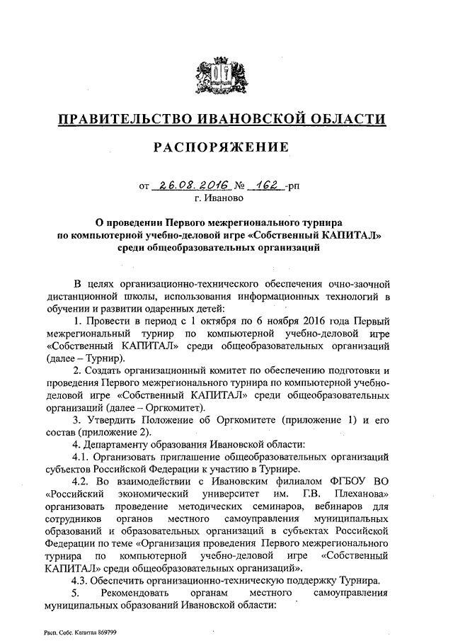 Распоряжение Правительства Ивановской области от 26.08.2016 N 162-рп "О проведении Первого межрегионального турнира по компьютерной учебно-деловой игре "Собственный КАПИТАЛ" среди общеобразовательных организаций" (вместе с "Положением об организационном комитете по обеспечению подготовки и проведения Первого межрегионального турнира по компьютерной учебно-деловой игре "Собственный КАПИТАЛ" среди общеобразовательных организаций")