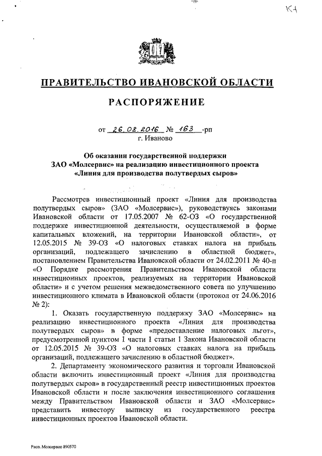 Распоряжение Правительства Ивановской области от 26.08.2016 N 163-рп "Об оказании государственной поддержки ЗАО "Молсервис" на реализацию инвестиционного проекта "Линия для производства полутвердых сыров"