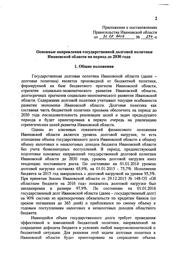 Постановление Правительства Ивановской области от 31.08.2016 N 274-п "Об утверждении основных направлений государственной долговой политики Ивановской области на период до 2030 года"