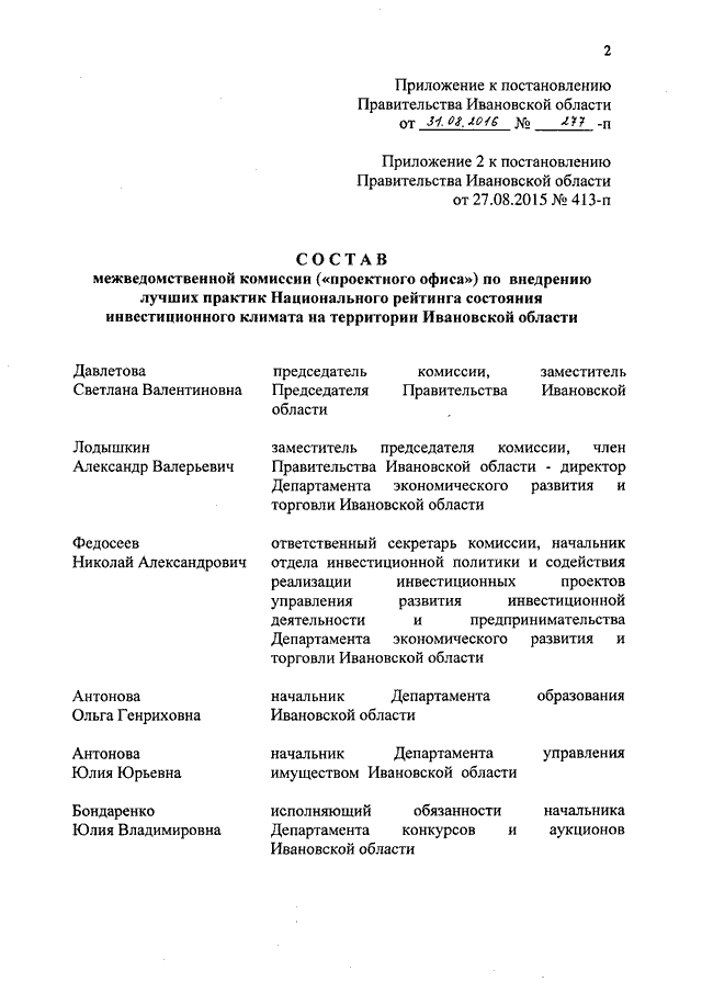 Постановление Правительства Ивановской области от 31.08.2016 N 277-п "О внесении изменения в постановление Правительства Ивановской области от 27.08.2015 N 413-п "О создании межведомственной комиссии ("проектного офиса") по внедрению лучших практик Национального рейтинга состояния инвестиционного климата на территории Ивановской области"