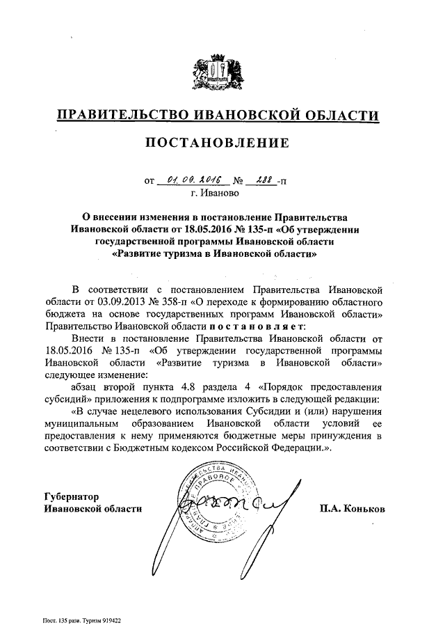 Постановление Правительства Ивановской области от 01.09.2016 N 288-п "О внесении изменения в постановление Правительства Ивановской области от 18.05.2016 N 135-п "Об утверждении государственной программы Ивановской области "Развитие туризма в Ивановской области"