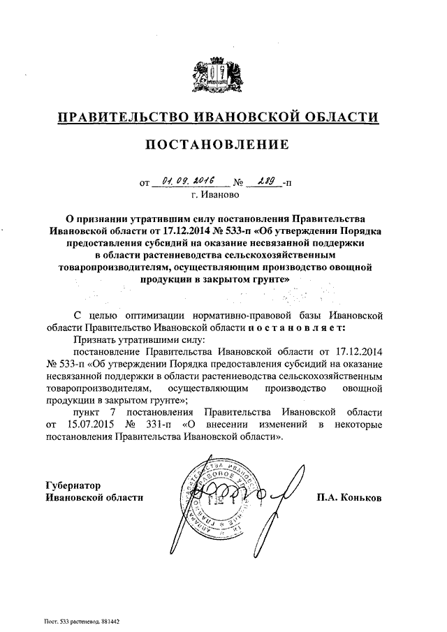 Постановление Правительства Ивановской области от 01.09.2016 N 289-п "О признании утратившим силу постановления Правительства Ивановской области от 17.12.2014 N 533-п "Об утверждении Порядка предоставления субсидий на оказание несвязанной поддержки в области растениеводства сельскохозяйственным товаропроизводителям, осуществляющим производство овощной продукции в закрытом грунте"