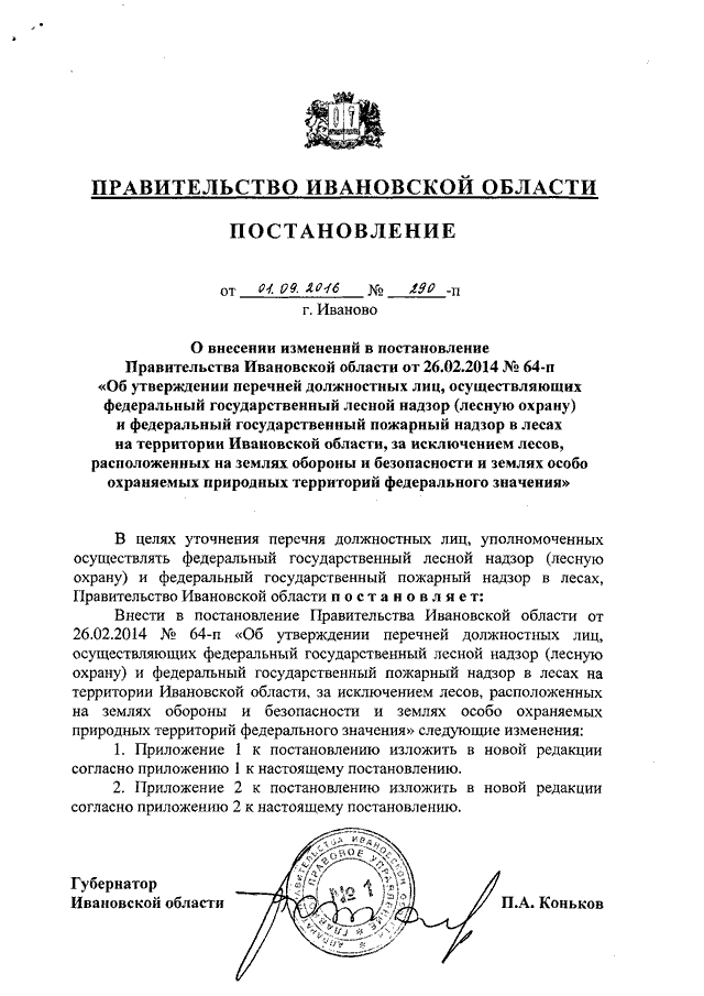 Постановление Правительства Ивановской области от 01.09.2016 N 290-п "О внесении изменений в постановление Правительства Ивановской области от 26.02.2014 N 64-п "Об утверждении перечней должностных лиц, осуществляющих федеральный государственный лесной надзор (лесную охрану) и федеральный государственный пожарный надзор в лесах на территории Ивановской области, за исключением лесов, расположенных на землях обороны и безопасности и землях особо охраняемых природных территорий федерального значения"