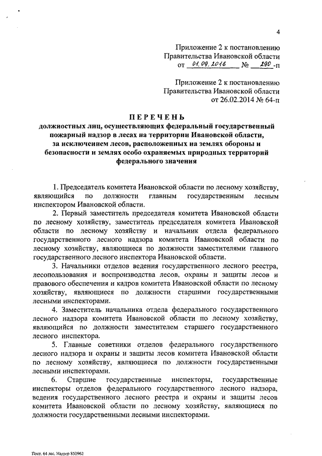 Постановление Правительства Ивановской области от 01.09.2016 N 290-п "О внесении изменений в постановление Правительства Ивановской области от 26.02.2014 N 64-п "Об утверждении перечней должностных лиц, осуществляющих федеральный государственный лесной надзор (лесную охрану) и федеральный государственный пожарный надзор в лесах на территории Ивановской области, за исключением лесов, расположенных на землях обороны и безопасности и землях особо охраняемых природных территорий федерального значения"