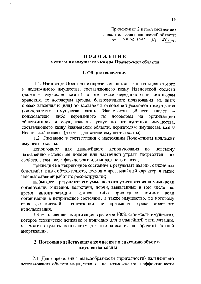 Постановление Правительства Ивановской области от 07.09.2016 N 304-п "О списании имущества, находящегося в собственности Ивановской области, и о признании утратившим силу постановления Правительства Ивановской области от 07.04.2015 N 119-п "Об утверждении Положения о списании имущества, находящегося в собственности Ивановской области" (вместе с "Положением о списании имущества, находящегося в собственности Ивановской области, закрепленного на праве хозяйственного ведения за государственными унитарными предприятиями Ивановской области, на праве оперативного управления за государственными учреждениями Ивановской области (казенными, бюджетными или автономными) и исполнительными органами государственной власти Ивановской области", "Положением о списании имущества казны Ивановской области")