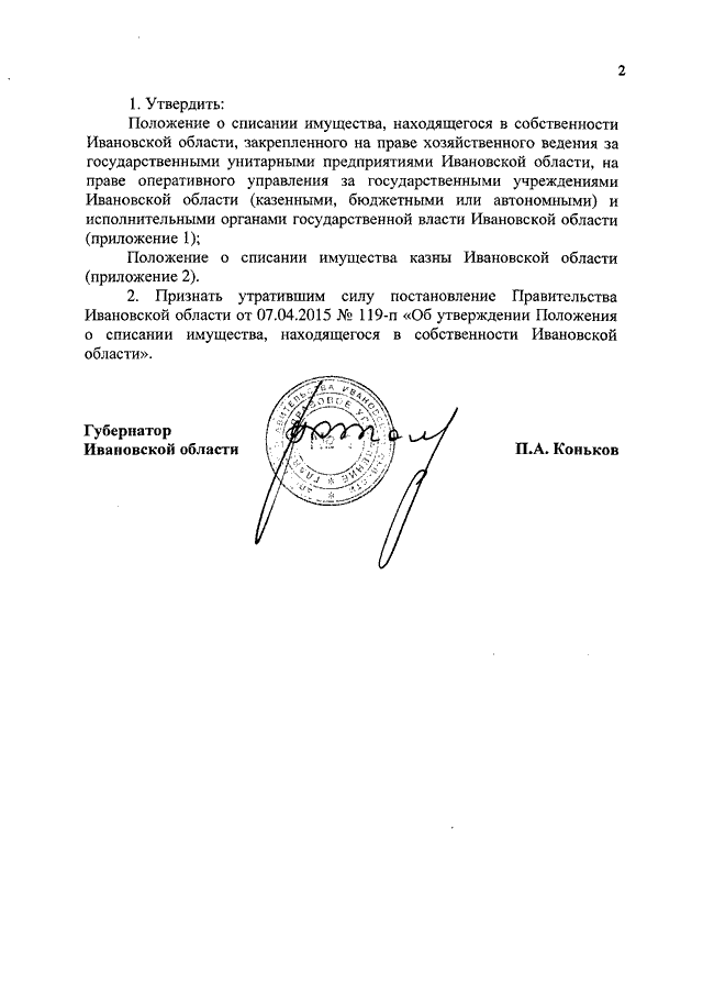 Постановление Правительства Ивановской области от 07.09.2016 N 304-п "О списании имущества, находящегося в собственности Ивановской области, и о признании утратившим силу постановления Правительства Ивановской области от 07.04.2015 N 119-п "Об утверждении Положения о списании имущества, находящегося в собственности Ивановской области" (вместе с "Положением о списании имущества, находящегося в собственности Ивановской области, закрепленного на праве хозяйственного ведения за государственными унитарными предприятиями Ивановской области, на праве оперативного управления за государственными учреждениями Ивановской области (казенными, бюджетными или автономными) и исполнительными органами государственной власти Ивановской области", "Положением о списании имущества казны Ивановской области")