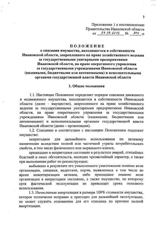 Постановление Правительства Ивановской области от 07.09.2016 N 304-п "О списании имущества, находящегося в собственности Ивановской области, и о признании утратившим силу постановления Правительства Ивановской области от 07.04.2015 N 119-п "Об утверждении Положения о списании имущества, находящегося в собственности Ивановской области" (вместе с "Положением о списании имущества, находящегося в собственности Ивановской области, закрепленного на праве хозяйственного ведения за государственными унитарными предприятиями Ивановской области, на праве оперативного управления за государственными учреждениями Ивановской области (казенными, бюджетными или автономными) и исполнительными органами государственной власти Ивановской области", "Положением о списании имущества казны Ивановской области")