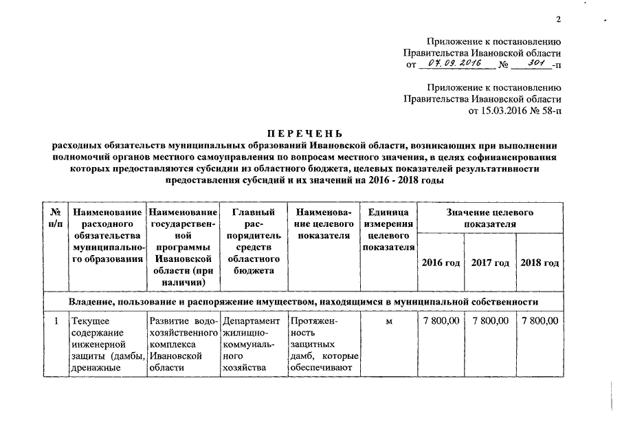 Постановление Правительства Ивановской области от 07.09.2016 N 301-п "О внесении изменения в постановление Правительства Ивановской области от 15.03.2016 N 58-п "Об утверждении перечня расходных обязательств муниципальных образований Ивановской области, возникающих при выполнении полномочий органов местного самоуправления по вопросам местного значения, в целях софинансирования которых предоставляются субсидии из областного бюджета, целевых показателей результативности предоставления субсидий и их значений на 2016 - 2018 годы"