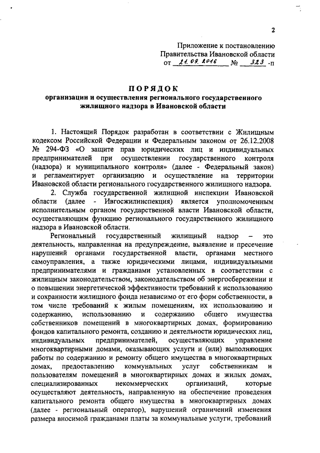 Постановление Правительства Ивановской области от 21.09.2016 N 323-п "Об утверждении Порядка организации и осуществления регионального государственного жилищного надзора в Ивановской области"