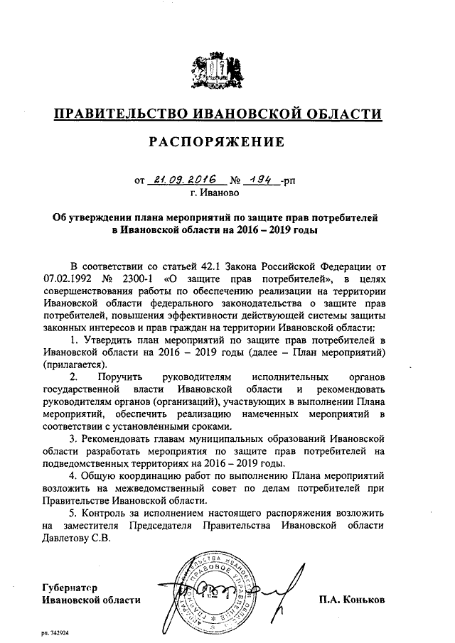 Распоряжение Правительства Ивановской области от 21.09.2016 N 194-рп "Об утверждении плана мероприятий по защите прав потребителей в Ивановской области на 2016 - 2019 годы"