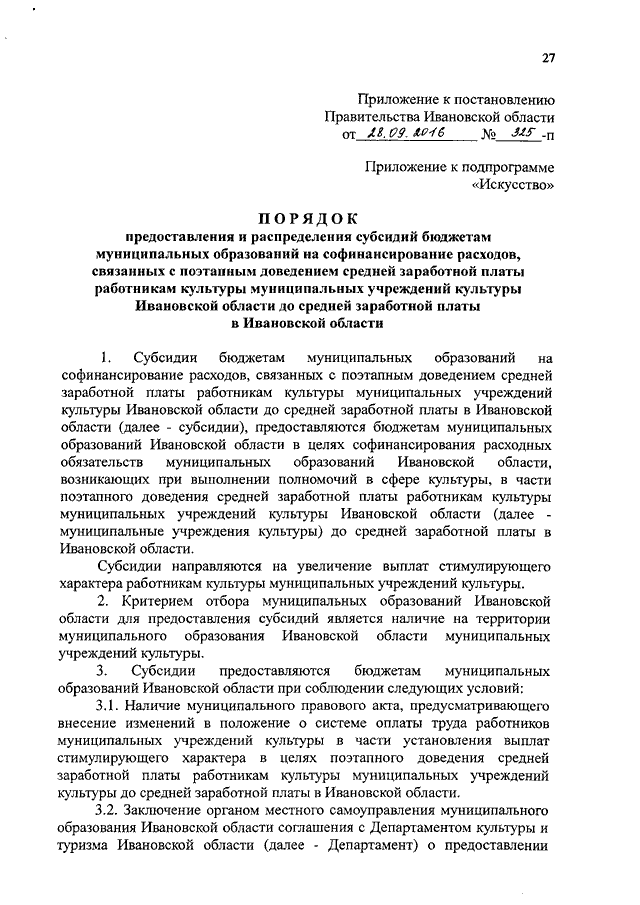 Постановление Правительства Ивановской области от 28.09.2016 N 325-п "О внесении изменений в постановление Правительства Ивановской области от 13.11.2013 N 453-п "Об утверждении государственной программы Ивановской области "Культура Ивановской области" (вместе с "Порядком предоставления и распределения субсидий бюджетам муниципальных образований на софинансирование расходов, связанных с поэтапным доведением средней заработной платы работникам культуры муниципальных учреждений культуры Ивановской области до средней заработной платы в Ивановской области")