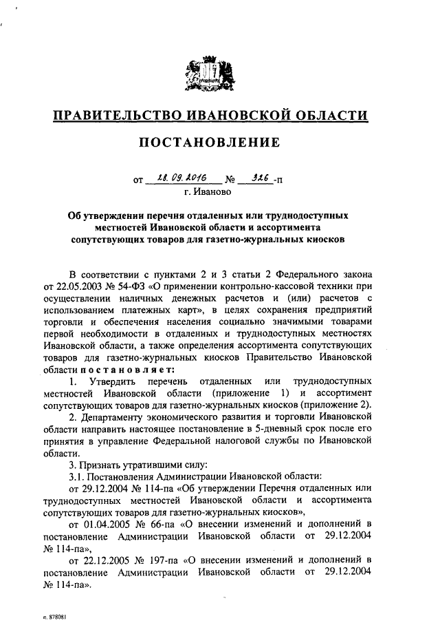 Постановление Правительства Ивановской области от 28.09.2016 N 326-п "Об утверждении перечня отдаленных или труднодоступных местностей Ивановской области и ассортимента сопутствующих товаров для газетно-журнальных киосков"