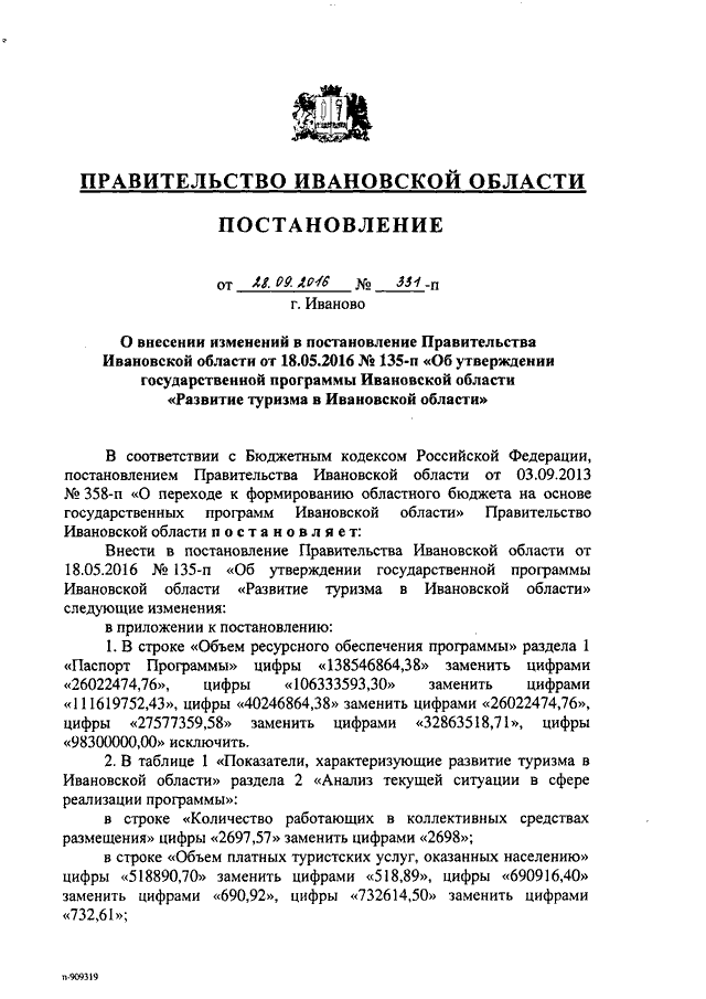 Постановление Правительства Ивановской области от 28.09.2016 N 331-п "О внесении изменений в постановление Правительства Ивановской области от 18.05.2016 N 135-п "Об утверждении государственной программы Ивановской области "Развитие туризма в Ивановской области"